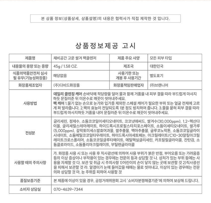[DAISO] CHAEBGONGGAN Oryza Sativa Pack Cleanser - 45g* Condition / NEW * Description A gentle pack-type cleanser formulated with Oryza Sativa (Rice) extract to help deeply cleanse impurities, remove excess sebum and dead skin cells, and soothe the skin with its naturally calming and moisturizing properties, leaving the complexion feeling clean, soft, and refreshed. * How to Use After wetting your face with lukewarm water, take an appropriate amount of the pack cleanser and massage it gently over the face in circular motions, focusing on areas with impurities or congestion. Leave it on for 1–2 minutes to let the pack formula work, then rinse thoroughly with lukewarm water. Use 2–3 times per week or as needed as part of your cleansing routine. * Major Ingredients Oryza Sativa (Rice) Extract, Glycerin, Butylene Glycol, Kaolin (White Clay), Niacinamide, Panthenol (Pro-Vitamin B5), Allantoin, Betaine, Camellia Sinensis (Green Tea) Leaf Extract, Chamomilla Recutita (Matricaria) Flower Extract, Portulaca Oleracea Extract, Sodium Hyaluronate (Hyaluronic Acid), Centella Asiatica Extract, 1,2-Hexanediol, Caprylyl Glycol, Ethylhexylglycerin, and Fragrance (Parfum). * Notice csteam@roseroseshop.com / cs@roseroseshop.com ※ Please refer to the Terms of Use before use. ※ Please Bear in Mind That Photo May Slightly Different From Actual Item in Terms of Color. ※ MFD or EXP? |
